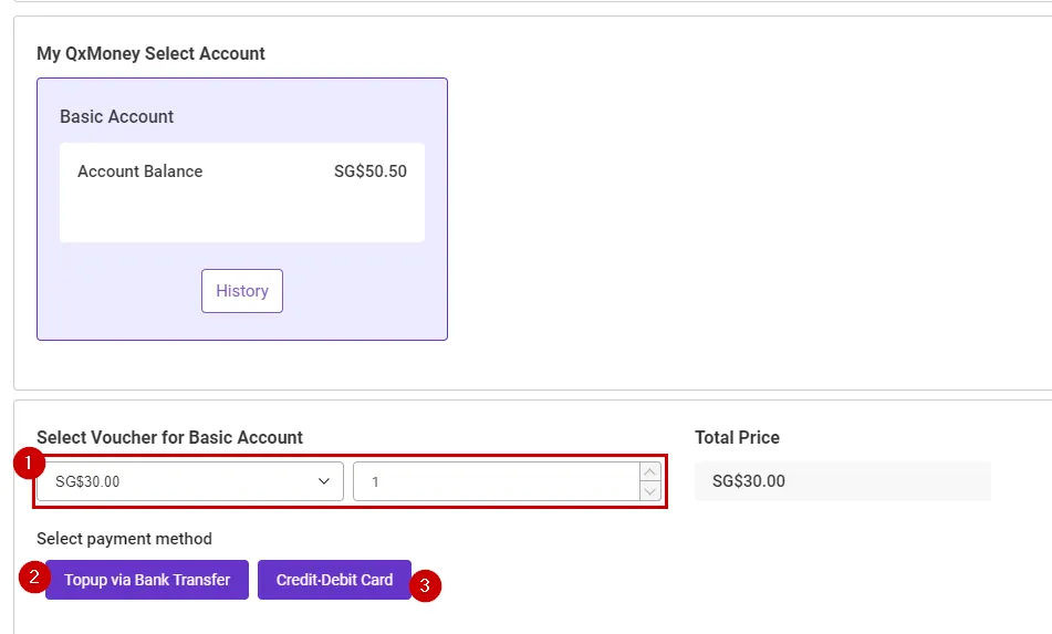 If you want to pay by bank account transfer, click [Topup via Bank Transfer]
