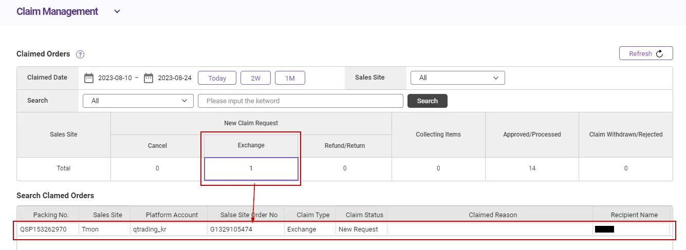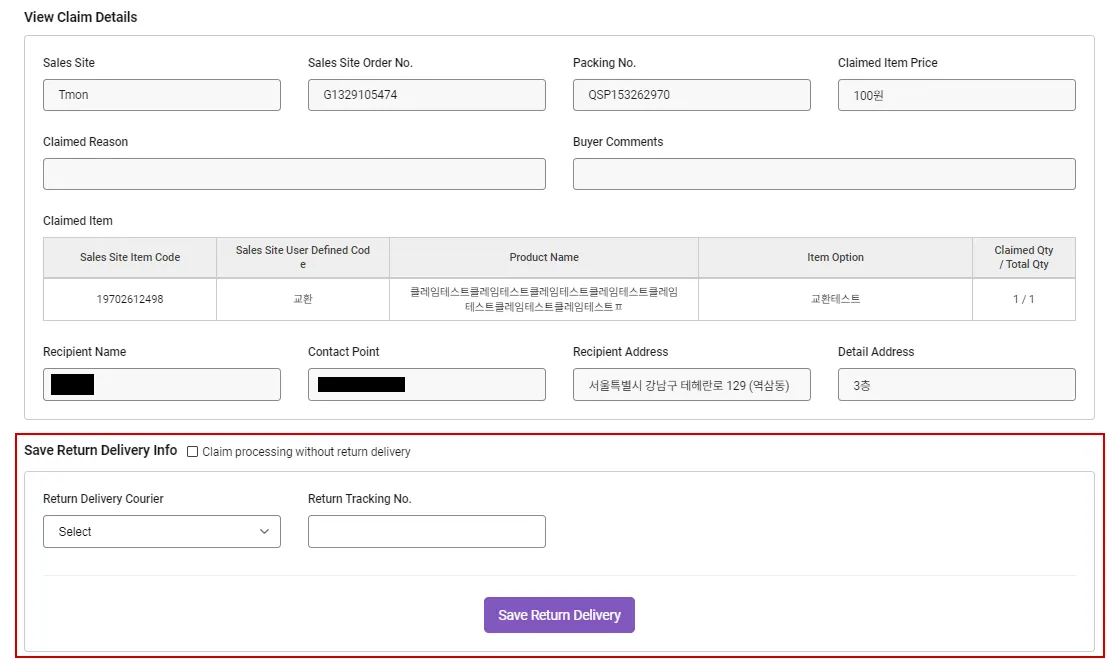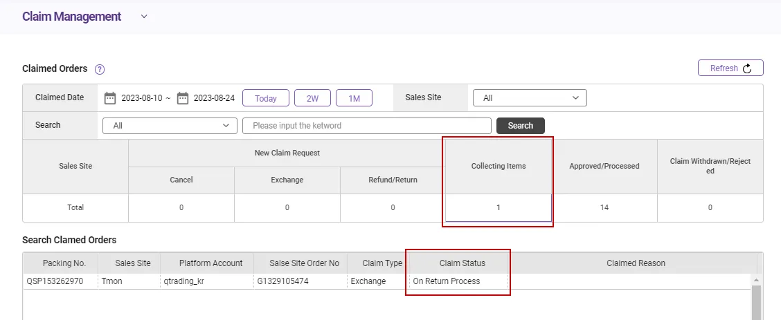 If the return delivery information is input, the claim status will be changed to ‘Collecting Items’ .