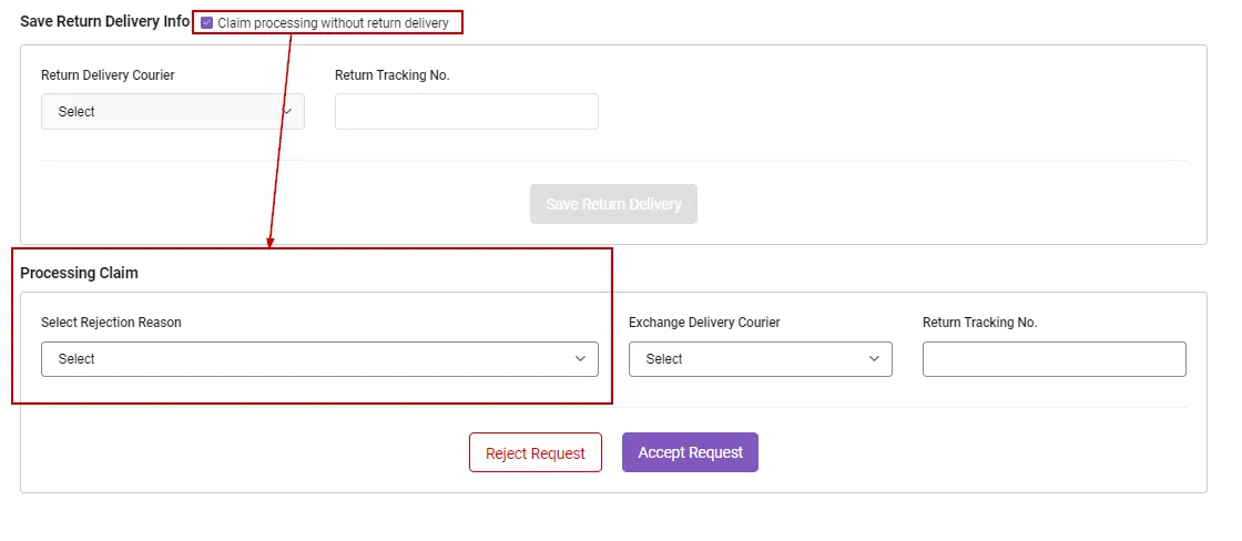 If you want to proceed the claim without return delivery, tick ‘Claim processing without return delivery’. Now you can accpet or reject the request directly.