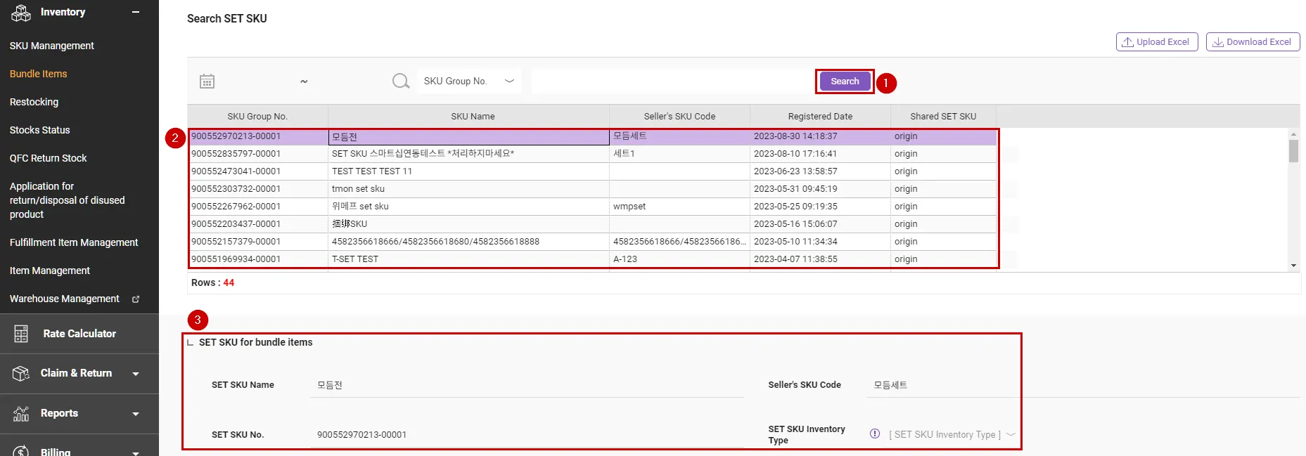A list of registered SET SKUs will appear, and when clicked, details will be displayed at the bottom.