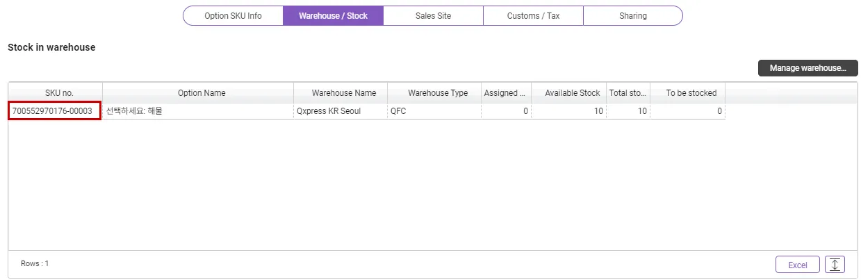 Stock in warehouse: You can check the warehouse and warehouse inventory status for each SKU.