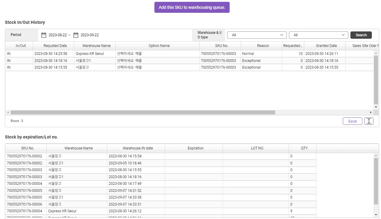 Stock In/Out History: Search the warehousing/delivering history of a specific SKU.