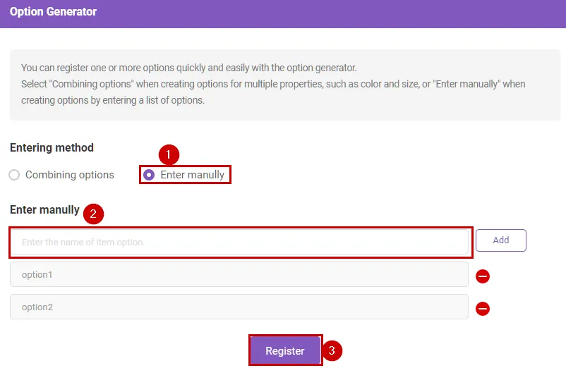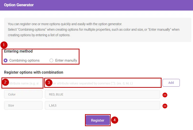 As a way to register options, single option registration, which registers individual options within a page, and the function of registering multiple options at once using the option generator are supported. The option generator helps you quickly create combination options and list options.