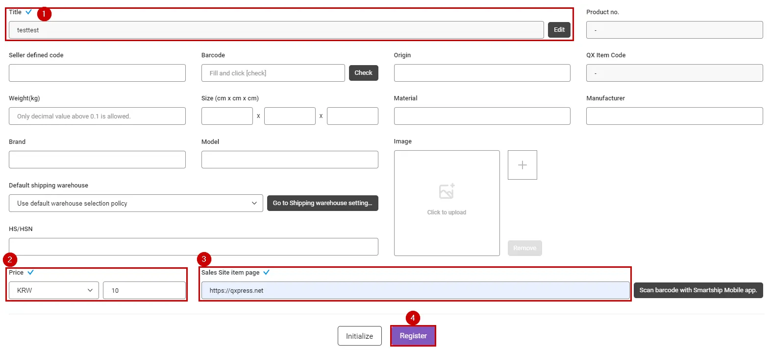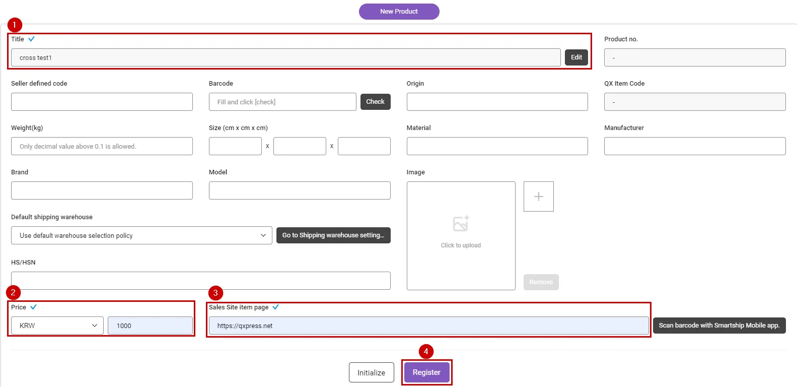 If you are editing another product, first click the [Initialize] button at the bottom of the form to switch to new registration status. You can register a product by entering the required information in the order below.