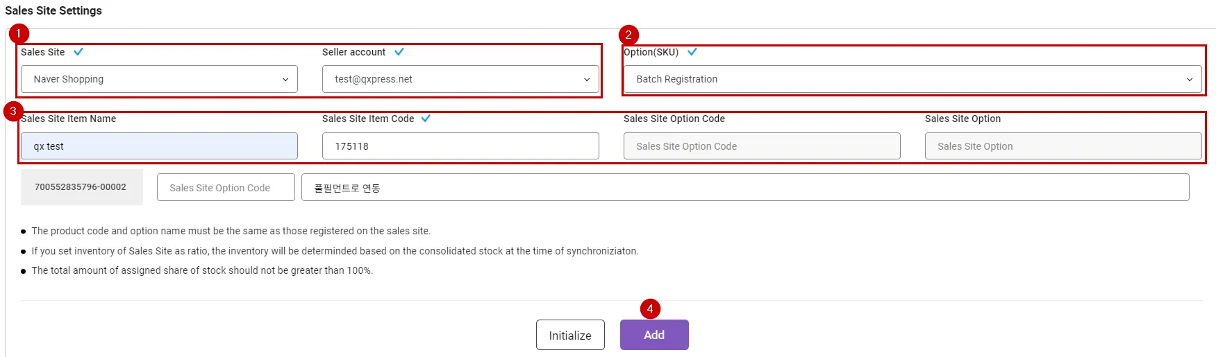If you add options to a single product, it changes to a multi-option product. At this time, if there is a “Seller’s definition code” registered for the product, the corresponding information will be deleted. The seller-defined code is information that connects the ordered product and inventory of the external sales channel, If the same Merchant Code is registered for different SKUs, there will be a problem that the order stock cannot be found correctly, resulting in a SKU association error in the fulfillment order.