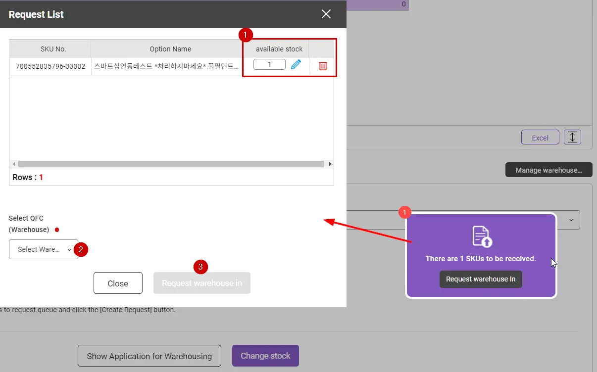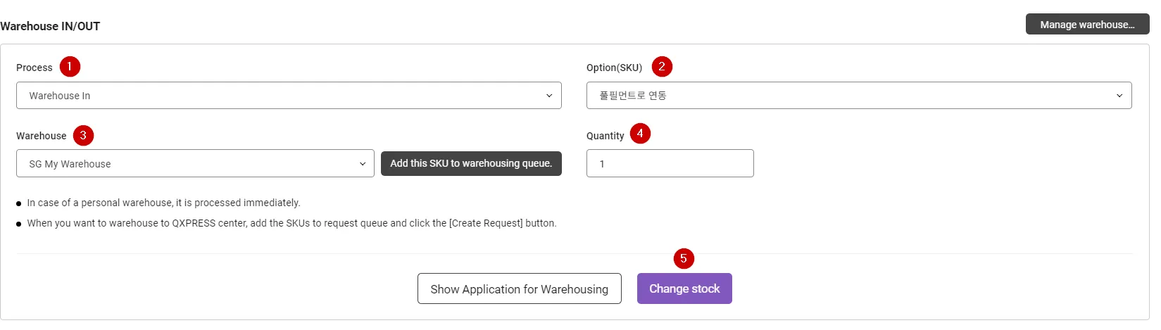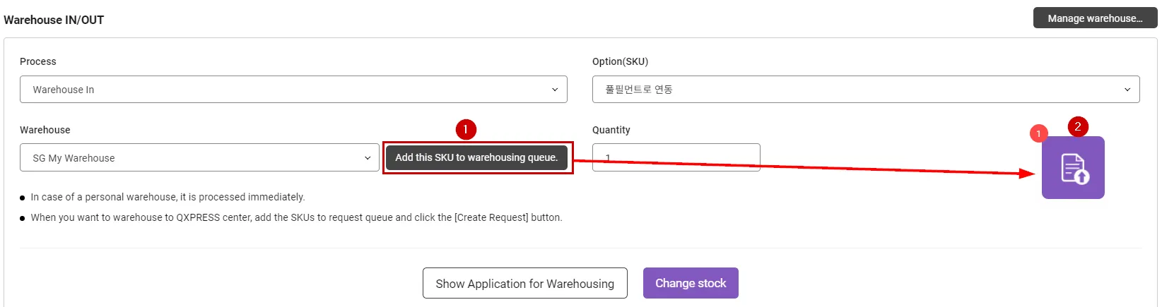 If you looking for how to request to SKUs for re-stocking/first time stocking, there is a button provided on the SKU management screen. In the ‘Warehouse IN/OUT’ tab, click and select the SKU of the product you want to stock, and then select “Add this SKU to warehousing queue” in the “Warehouse IN/OUT” area.