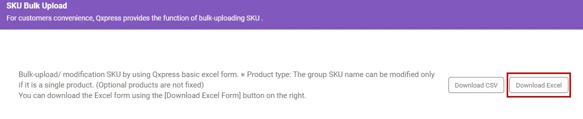 You can download the template to record product information in the upper right corner of the Excel upload pop-up window. There is a [Download CSV] button and [Download Excel] button. The CSV file is used only when more than 60,000 lines are required, and in general, the [Download Excel] button is used.