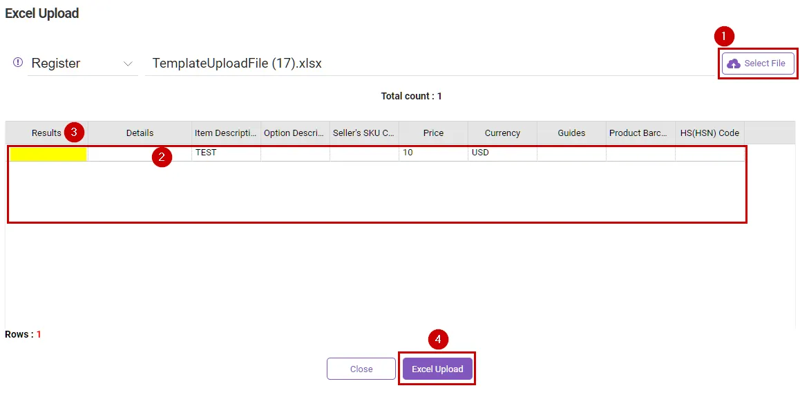 Please click the [Excel Upload] button. Click the Register button to complete information registration.