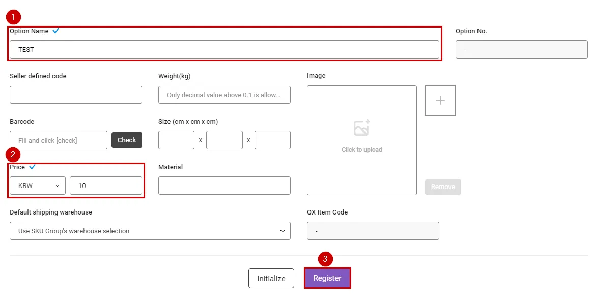 SKU Seller Management Code: If there is a management code for each option managed by itself, enter it.
