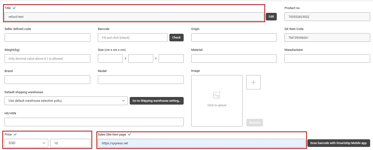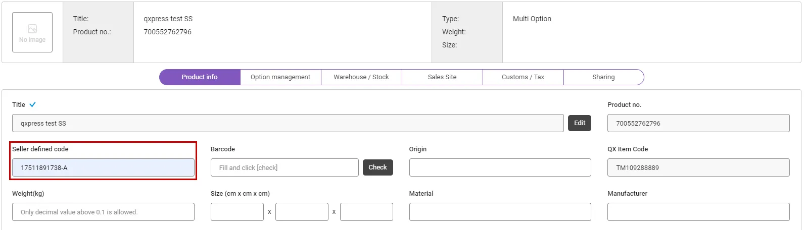 For a single product, enter the same management code as the product on the sales site in the “Seller Defined Code” field in the “Product Information” tab.