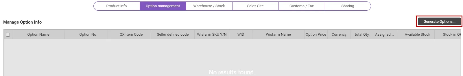 After selecting the “Manage Product Options” tab, click the [Generate Options] button on the right under the tab.