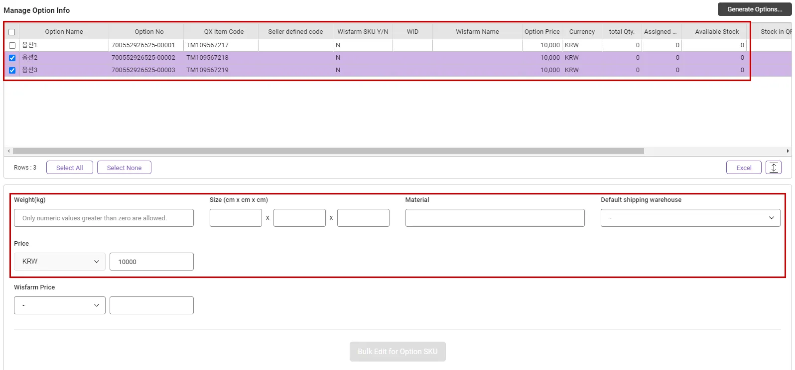 If you select multiple options at once in the ‘Manage Product Options’ tab, you can change the information of the selected options in bulk. Excluding values that cannot be duplicated, such as ‘option name’ or ‘seller-defined code’, information can be applied at once.