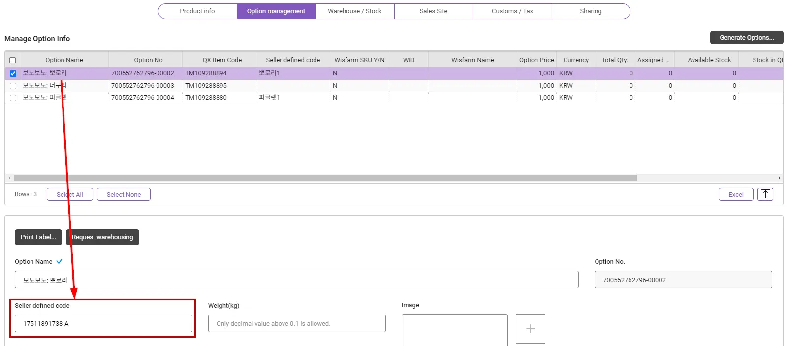 Therefore, at the time of adding an option to a single product, the seller-defined code value registered in the product is deleted. For multi-option products, please use the Vendor Defined Code field in each option.