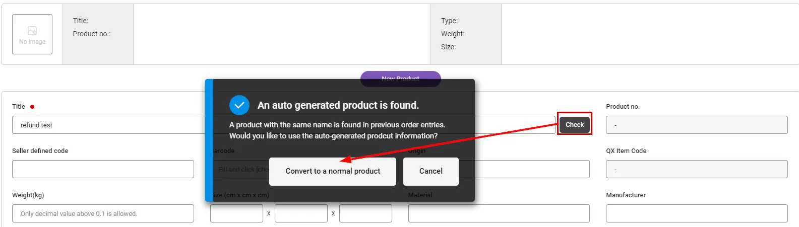 When registering a new product, if you run a duplicate check on the product name, you will see a pop-up message saying “An auto-registered product has been found.” At this time, if you click the [Convert to a normal product] button, the product is converted to the information collected in advance.