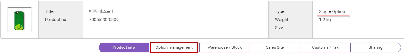 Registered products are divided into single products (single products) and option products (multi-option products) depending on whether options are included. A single product is a product itself that becomes one SKU, and an option product is a concept in which one or more options exist under a product, and each option becomes a SKU. In a multi-option product, the ‘product’ serves only to store information that each option has in common, and is not subject to inventory management.