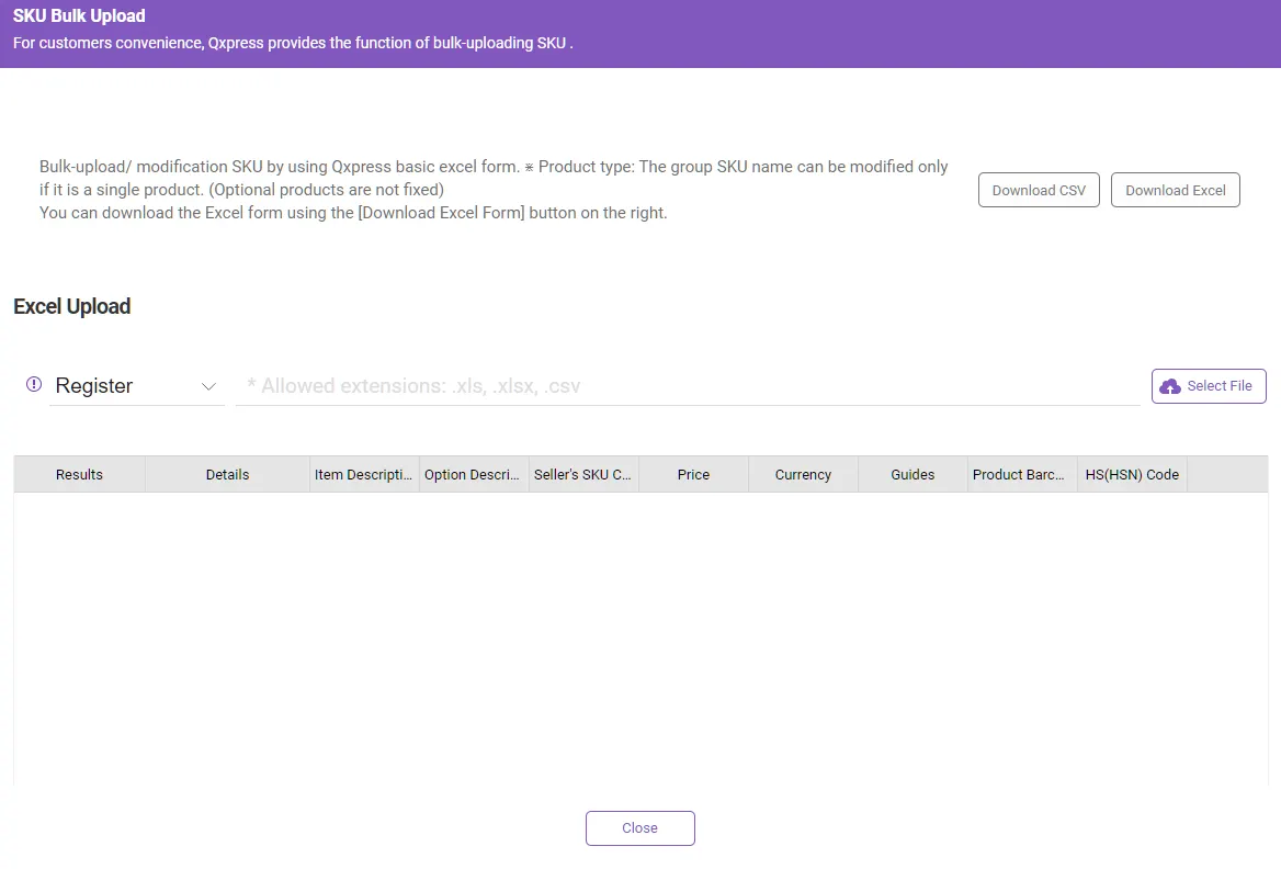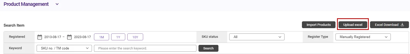 Click the [Upload Excel] button to display the SKU registration pop-up window.