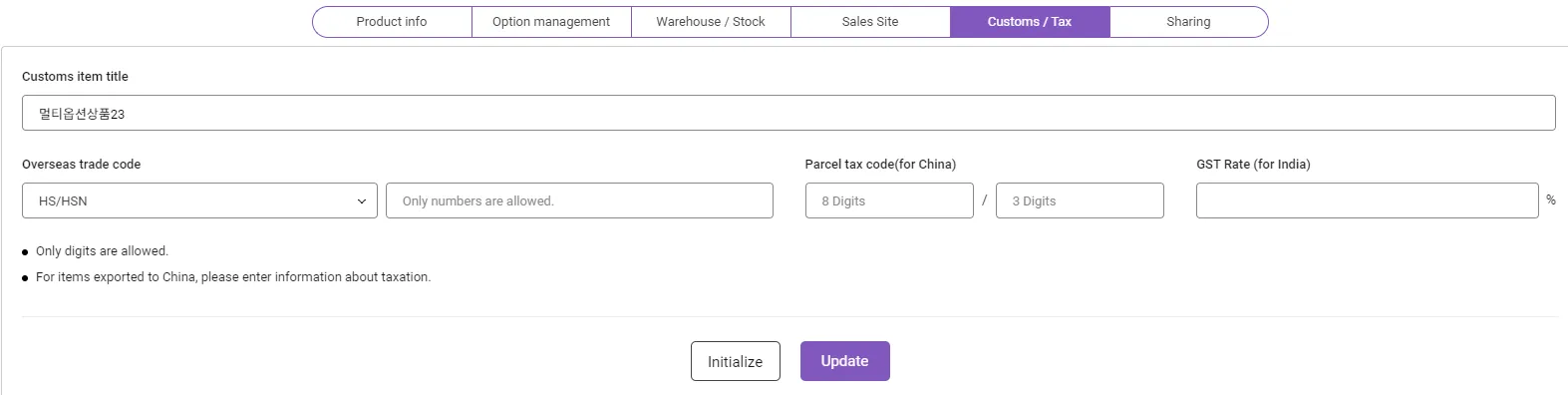 The “Customs/Tax” tab is where you can enter information required for customs clearance and customs rate information. Depending on the country to which the product is shipped, you can register the required information.