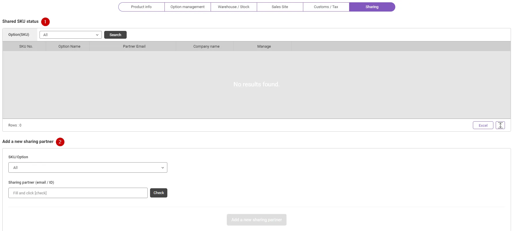In the “Sharing” tab, you can share your SKUs with other SmartShip sellers and consign sales. If you share a SKU, the partner can register and sell the shared SKU as a product on an external sales site like their own SKU.