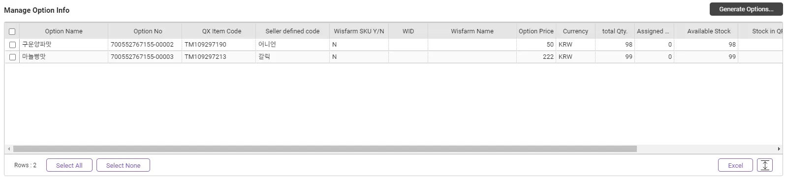 The Options Generator pop-up screen will appear, as shown below. In the option generator, by entering option properties and each option value, a list of combined options is created and registered in batches.