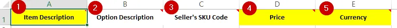 The order of each field in the template is important when uploading Excel. If you arbitrarily change the order of each column in Excel, it will not be registered correctly after uploading, so please keep the order of the fields as they are in the original form.