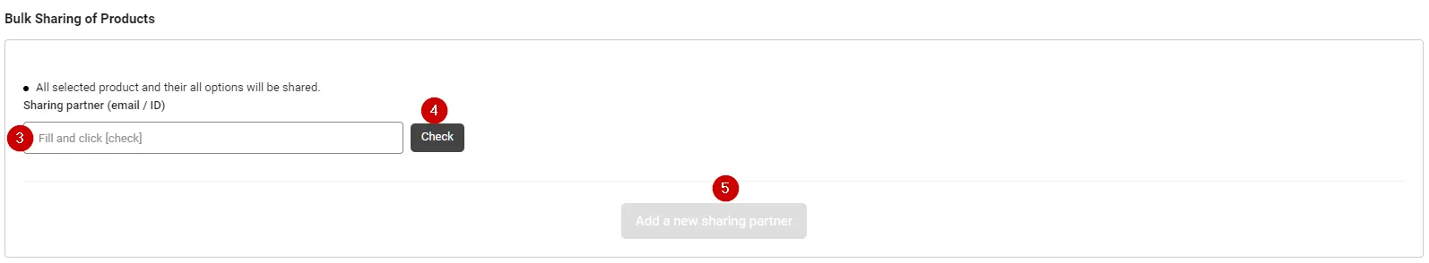 Enter partner information in the “Bulk Sharing of Products” area under the Bulk Edit Information area, and add a sharing partner. Partner registration is the same as adding a partner on an individual SKU.