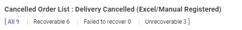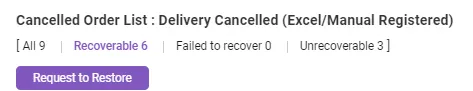 Delivery Cancelled (Excel/Manal Registered) : This is showing the orders cancelled by you/the seller and the original order created via Excel or UI. In this case, you can request to restore unless duplicated order found.