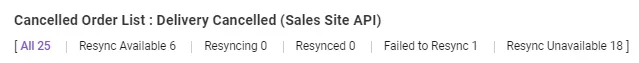 Failed to Resync : This is the case the resync job is failed due to the server error, invaild sales site’s order. Please check the order status on the sales site. Request to resync for the failed order is allowed.