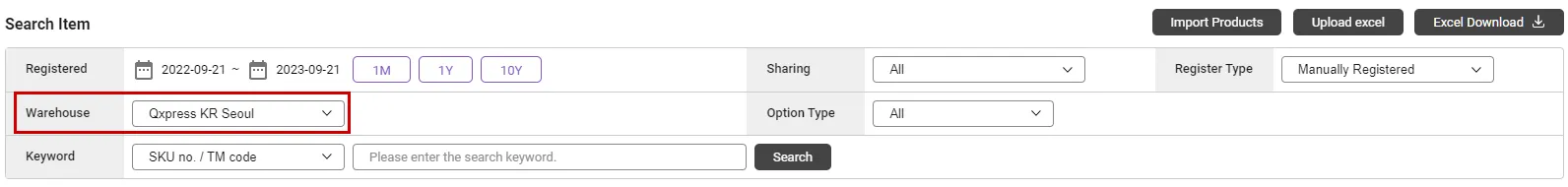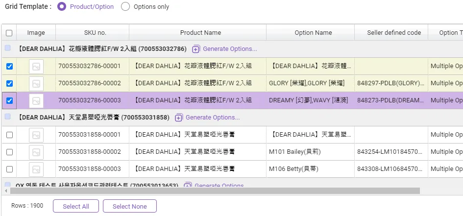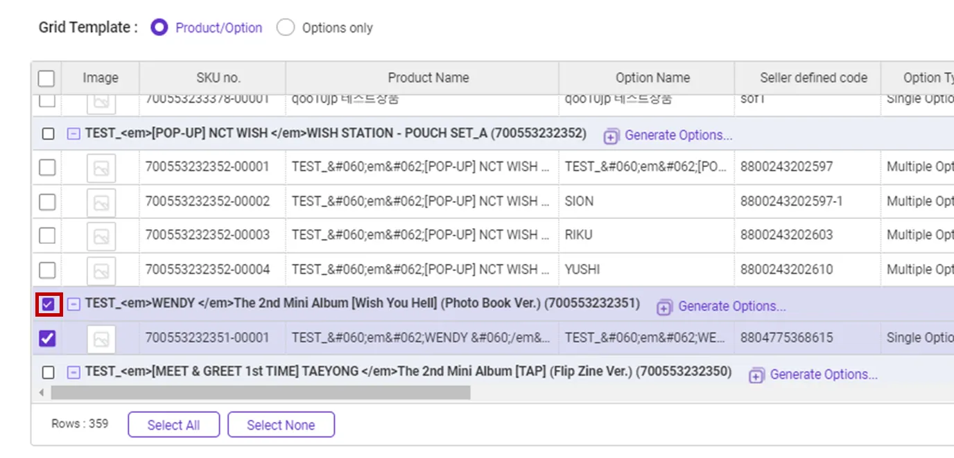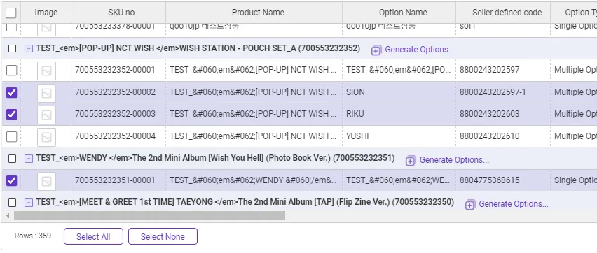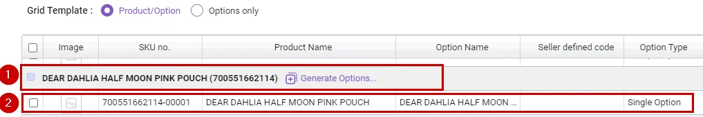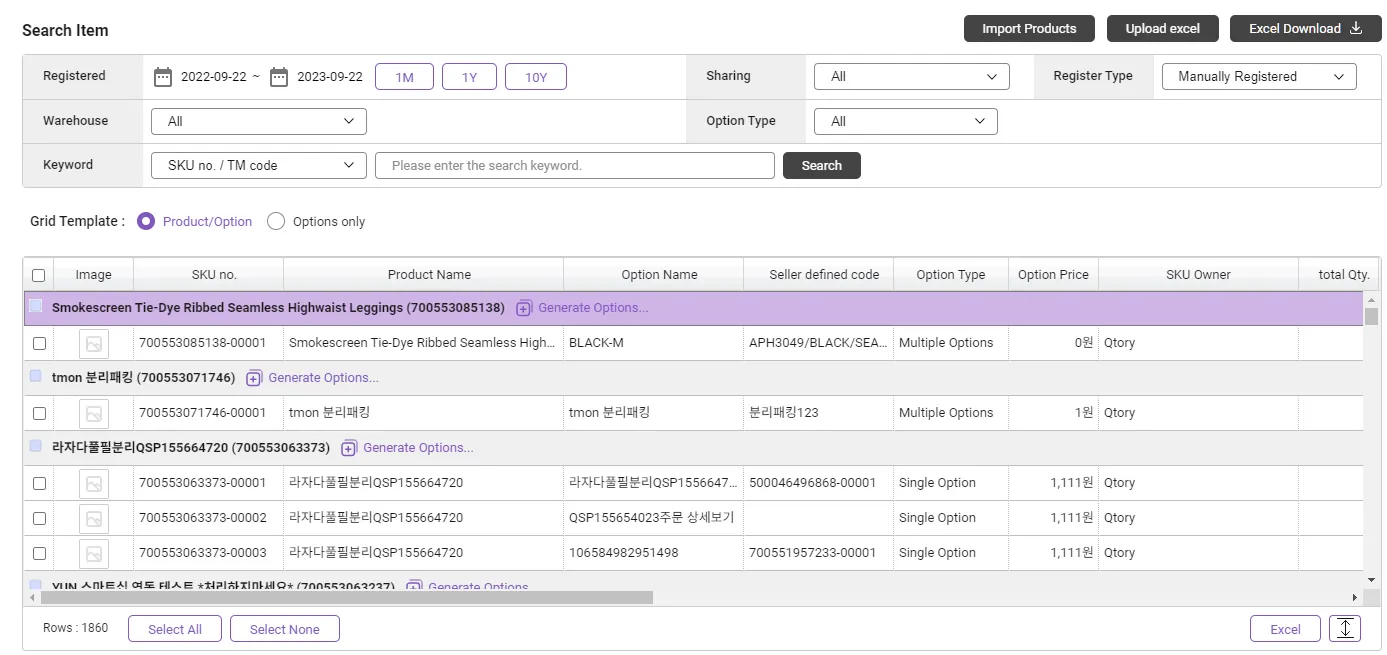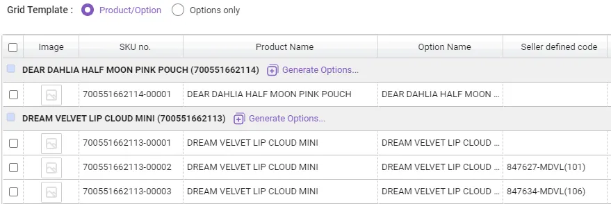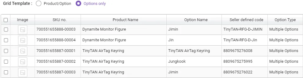 Products that cannot be registered due to duplicates : Attempting to register a product with an empty option name field as a single product. At this time, if there is a product registered with the same product name, the product with that name cannot be registered. If the data contains an option name, the option is added to the existing product. Additionally, “SKU Seller Management Code” cannot be duplicated in two or more SKUs.