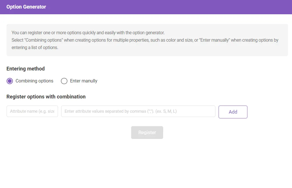 Option input method : You can choose between “Combining options” and “Enter manully”. “Combining options” automatically creates options with a combination of each attribute by entering attributes such as color/size/material, while the “Enter manully” method registers by entering each product list rather than a combination of attributes.