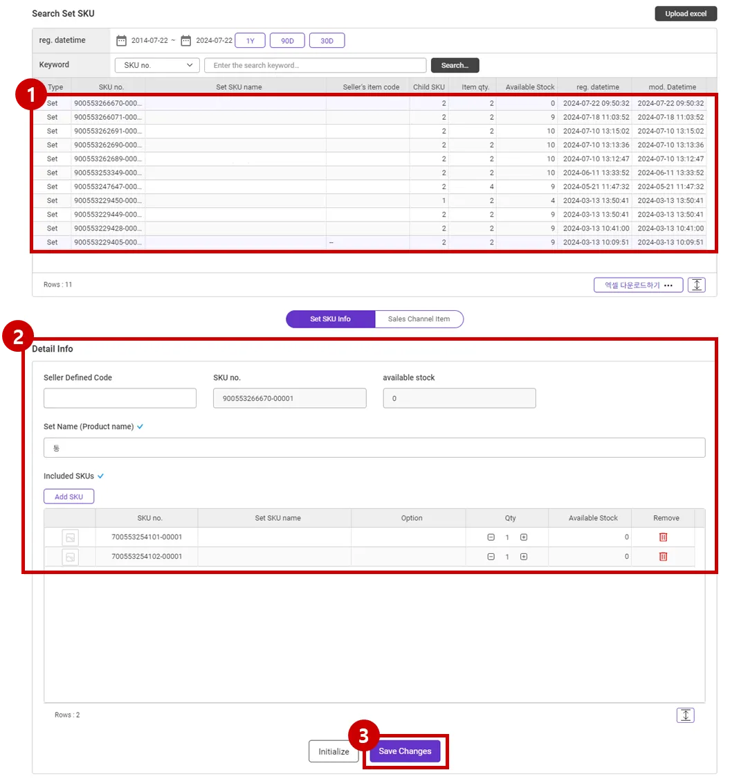 You can form a SET SKU by bundling multiple registered SKUs as one product. You can create a set product by linking the Set SKU and the product on the sales site. The method of linking a Set SKU to a sales site product is to use a seller management code in the same way as linking a single SKU to a sales site product.