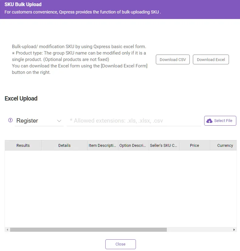 Click the [Upload Excel] button to display the SKU registration pop-up window.