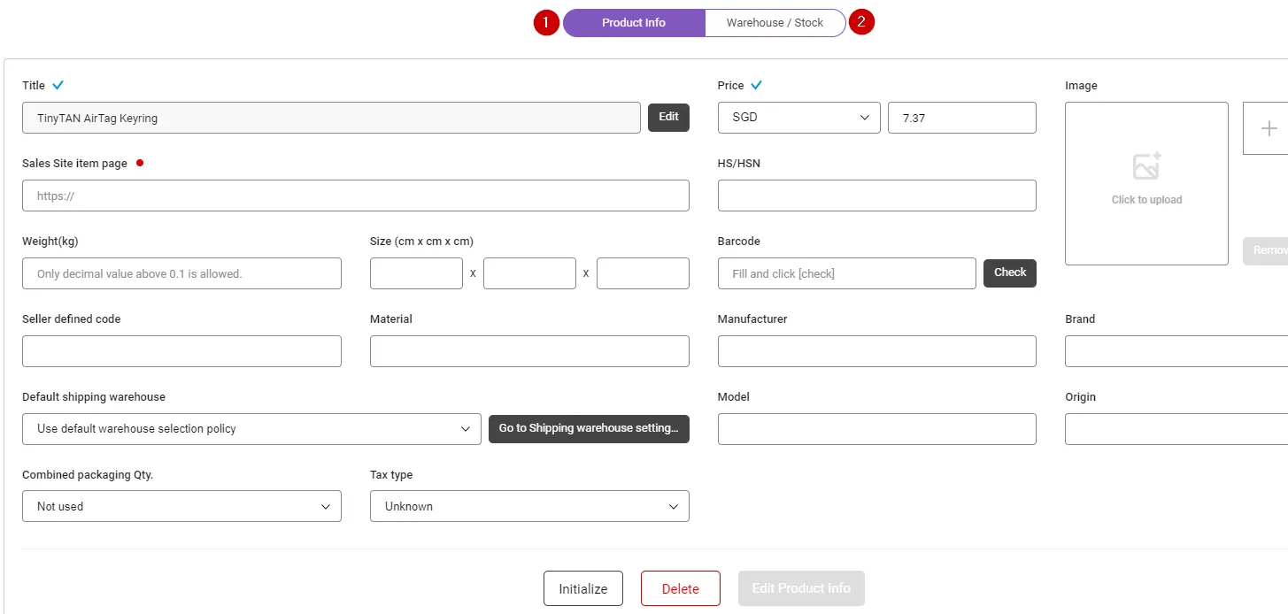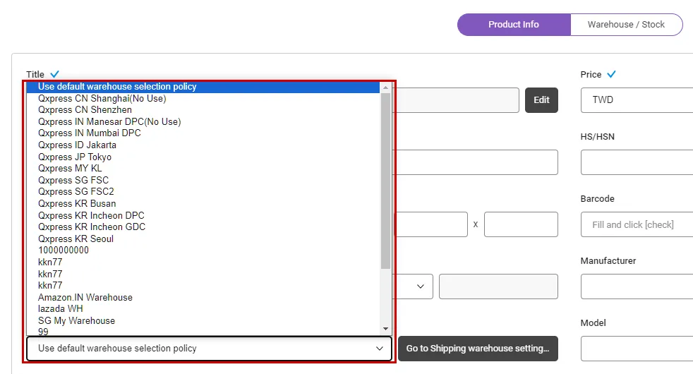 2-1. Default shipping warehouse settings for each SKU (single product)
