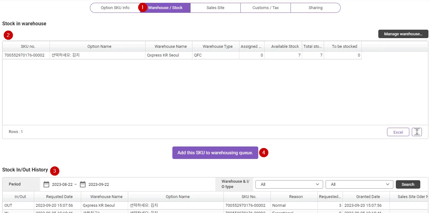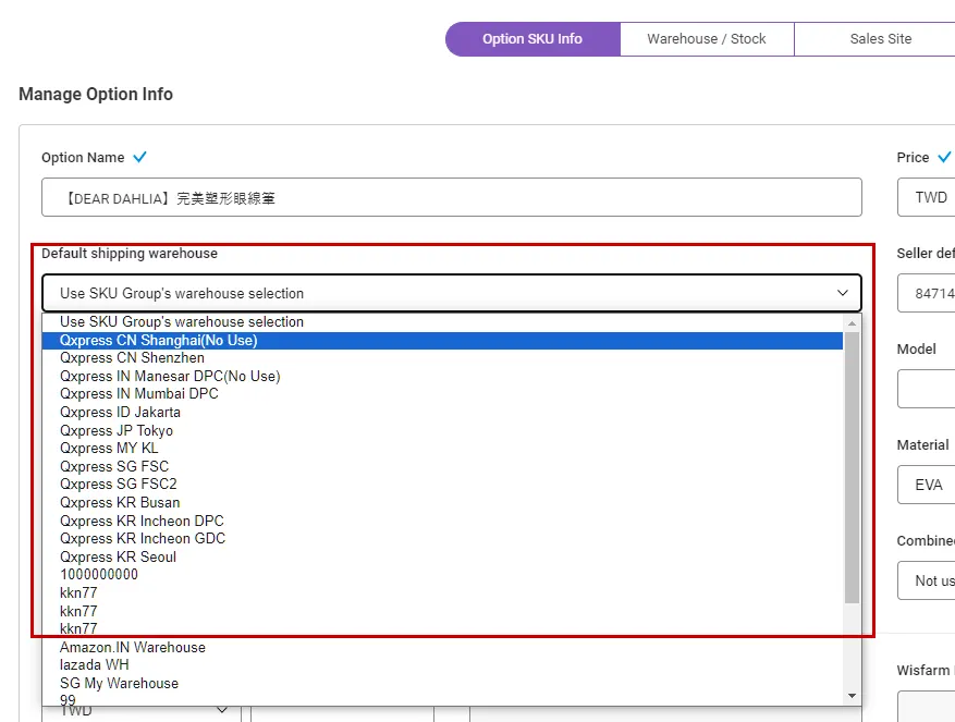 2-2. Default shipping warehouse settings for each SKU (option product)