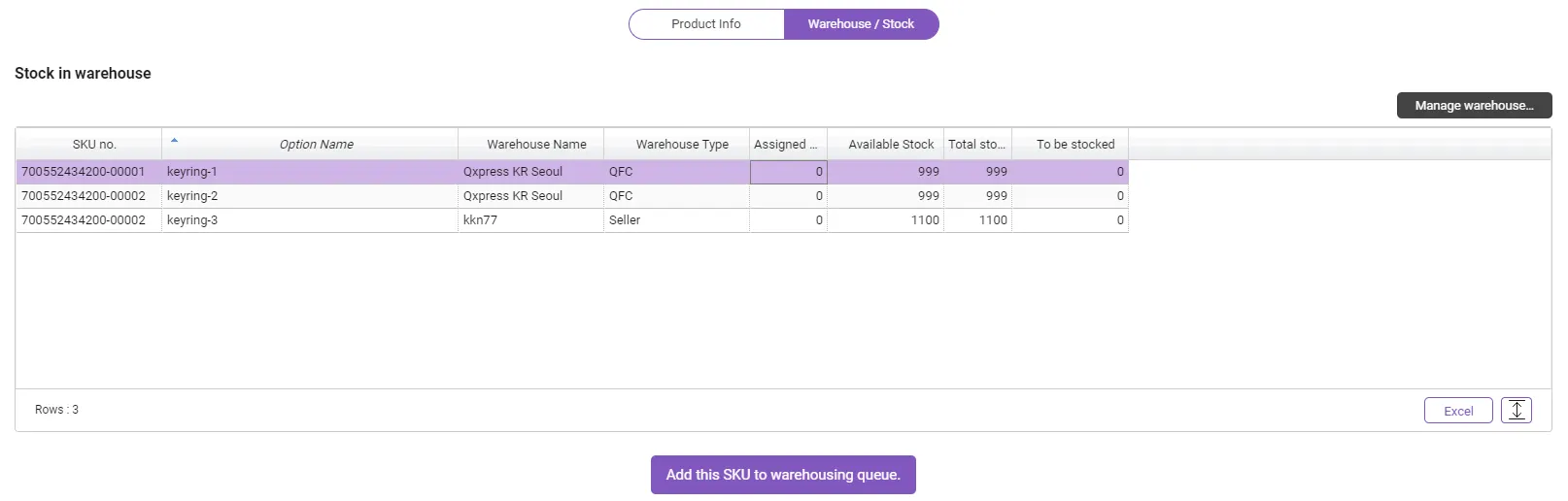 After selecting the SKU, select the “Warehouse / Stock” tab