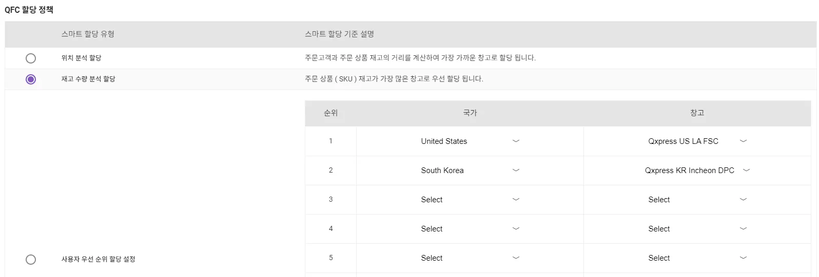 The shipping warehouse for products shipped from TFC can be applied to all SKUs at once, or a specific shipping warehouse can be set for each SKU. If a specific shipping warehouse is not set when registering a SKU, the allocation type set on the “Warehouse Assign Policy” page is applied. If a specific shipping warehouse is set for an individual SKU, that SKU will ignore the TFC allocation policy.