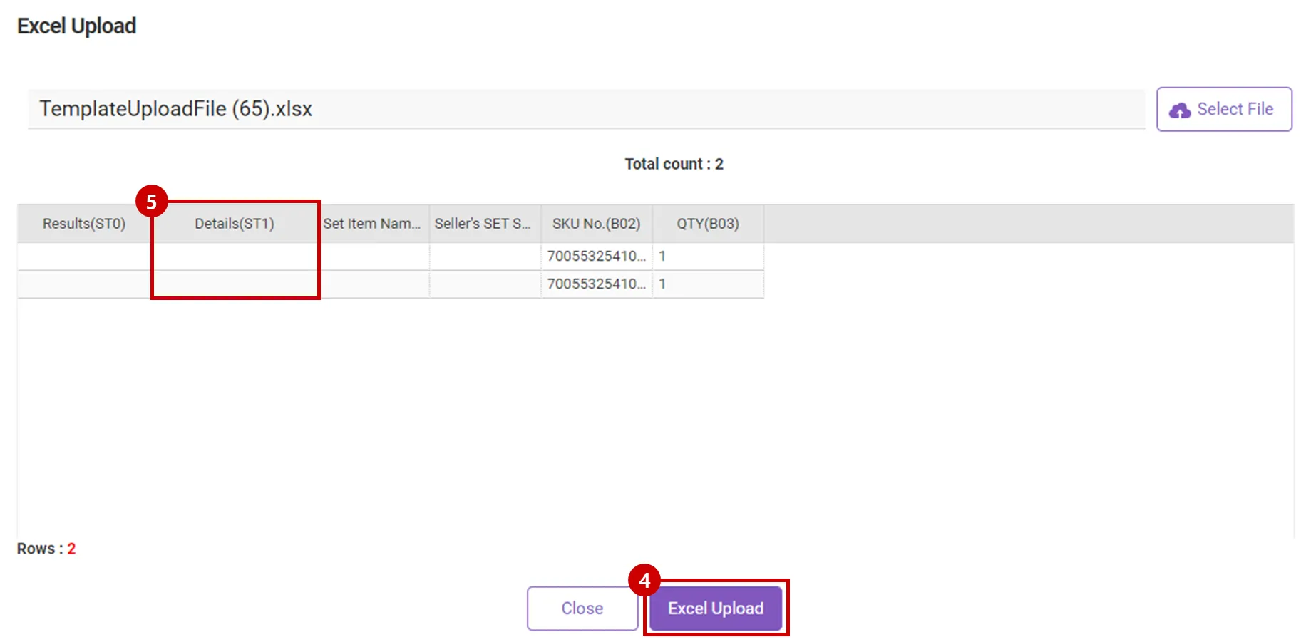 After the file has been successfully uploaded and you have confirmed that the data has been loaded, click the [excel Uploadl] button. If you are uploading a large amount of SET SKU data, please wait for a moment as there might be a delay.
