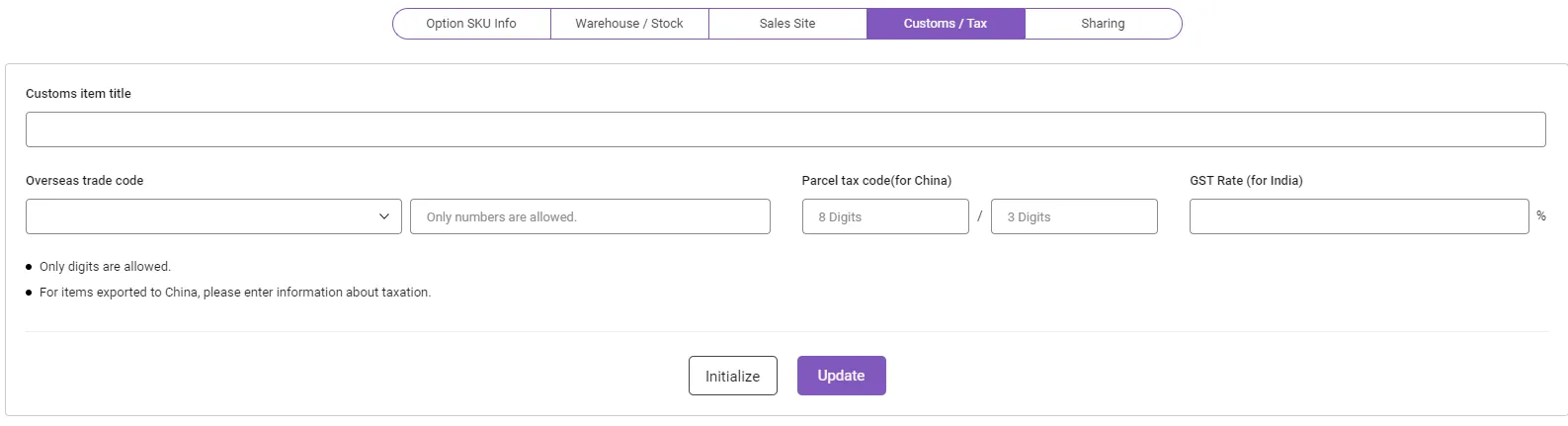 The “Customs/Tax” tab is where you can enter information required for customs clearance and Customs rate information. You can register the necessary information depending on the country the product is being shipped to.