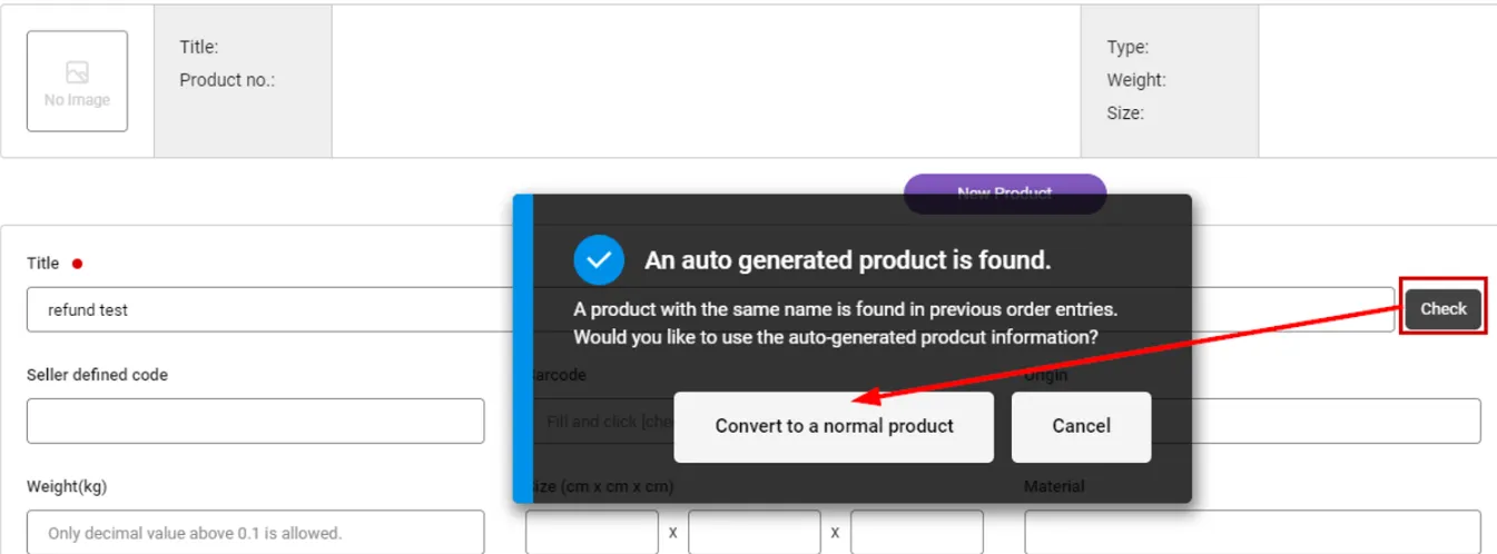 When you manually register a product with the same name, if the product name is duplicated, the message “An automatically generated product is found” will be displayed. At this time, if you select [Convert to a normal product], product information including price, URL, etc. will be automatically registered.
