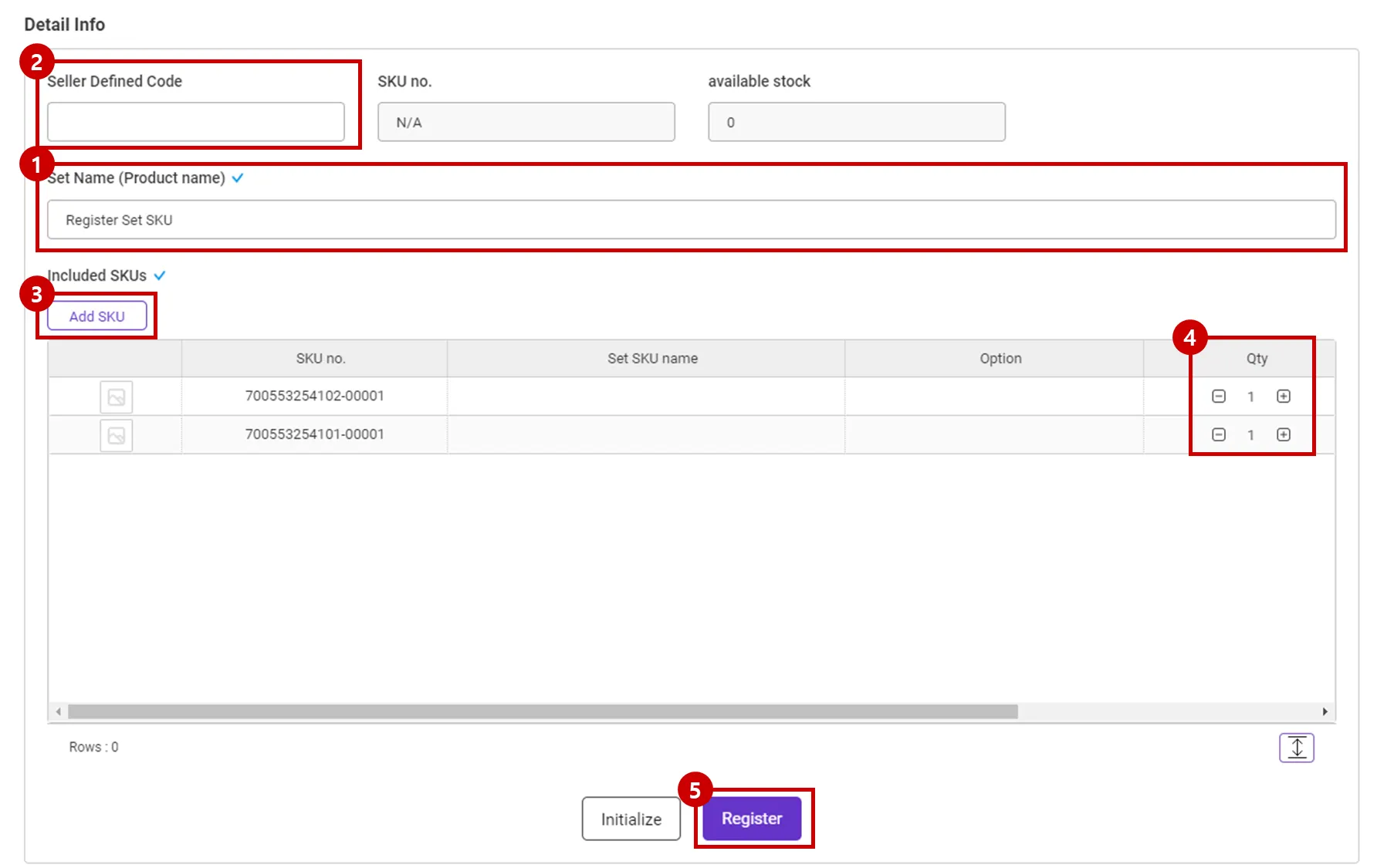 Click on the list of registered SET SKUs to display detailed information at the bottom.