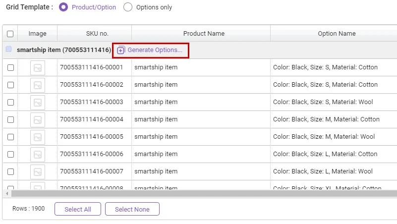 You can view and manage products & options in one grid.