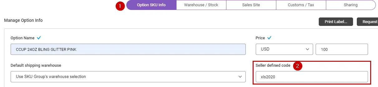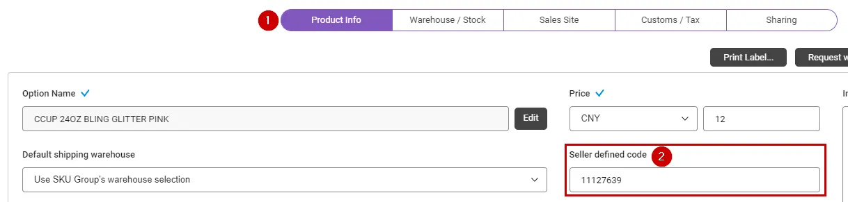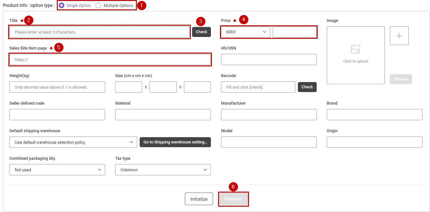 Seller Defined Code : You can enter the seller code for matching with an external sales site. This can only be entered for single products, and for multi-option products, the seller defined code must be entered only for each option.