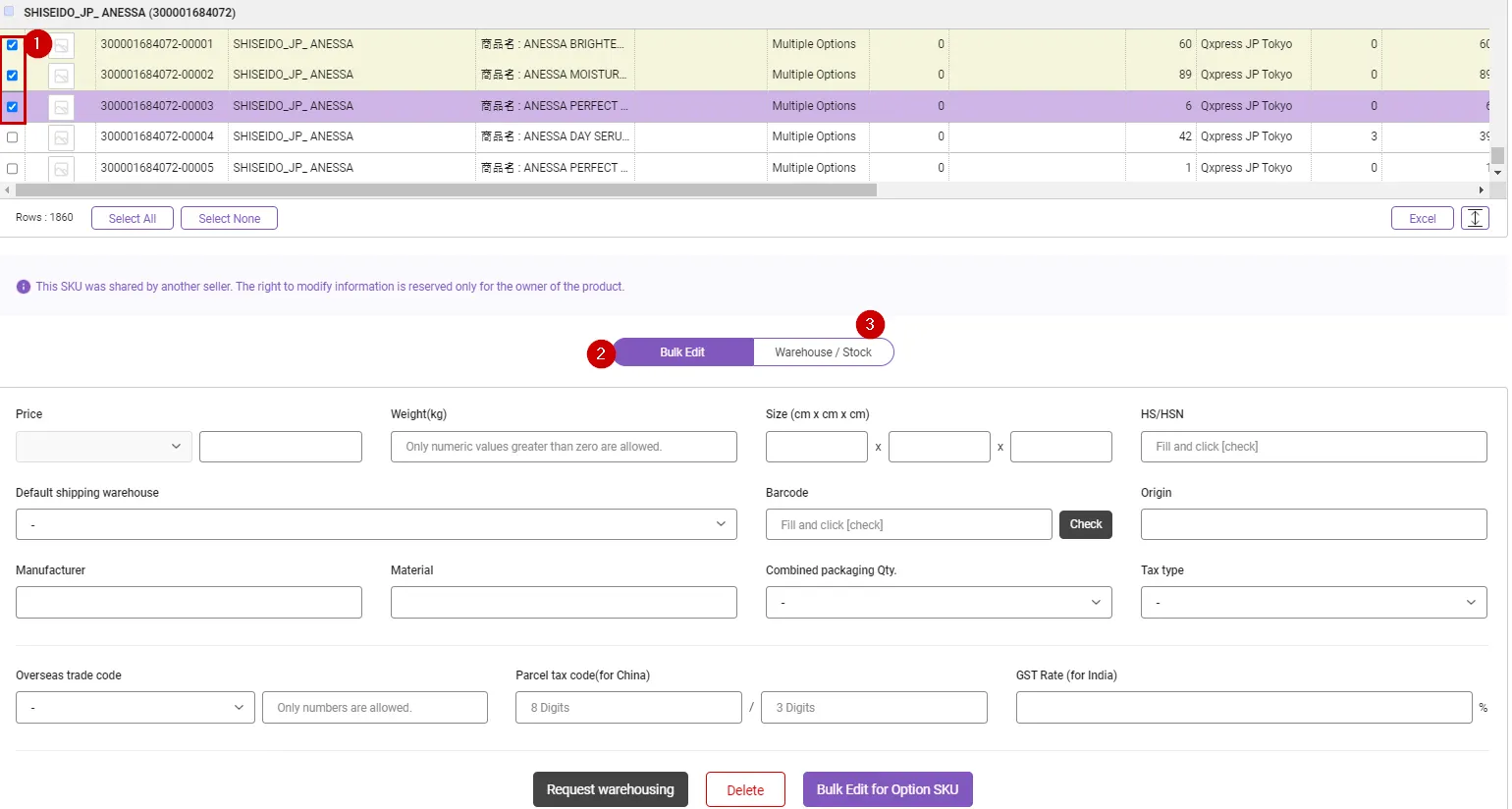 If you select two or more SKUs by checking them in the viewed grid, the UI at the bottom goes into bulk edit mode. At this time, if you select the “Warehouse / Stock” tab, the warehouse specific stock of the selected stock will be displayed. This feature allows you to easily determine warehouse stock for specific SKUs.
