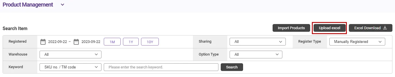 If you want to register a large number of products at once, you can enter product information in a predefined Excel template and upload it to register products in bulk.