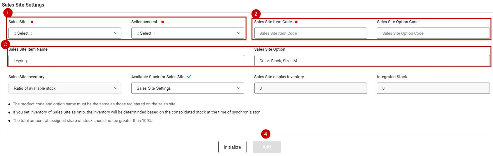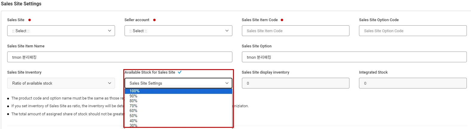 “Stock displayed in sales site” is the value when the ratio selected is applied to “Stock in integrated use.”