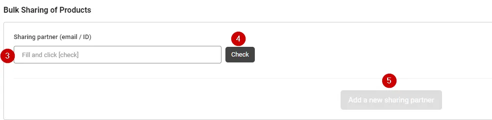 Enter partner information in the “Bulk Sharing of Products” area under the Bulk Edit Information area, and add a sharing partner. Partner registration is the same as adding a partner on an individual SKU.