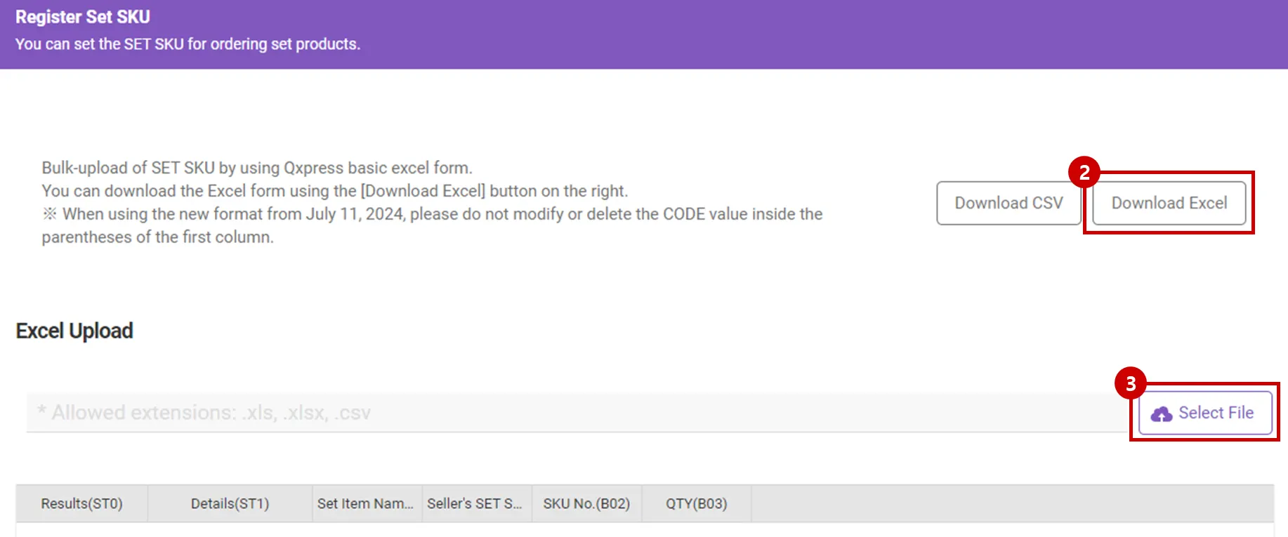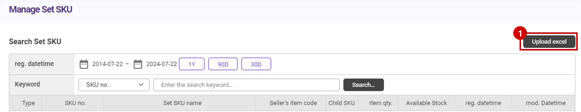 Please click the [Upload Excel] button at the top right of the SET SKU management page.