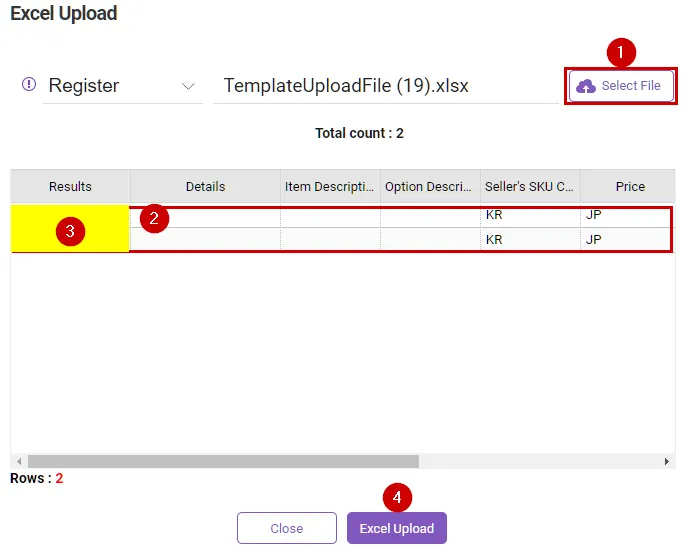 If required date is missing, they will be displayed in the ‘processing result’ area (yellow). If there are products missing required data, please edit the Excel file and click the [Select File] button again.
