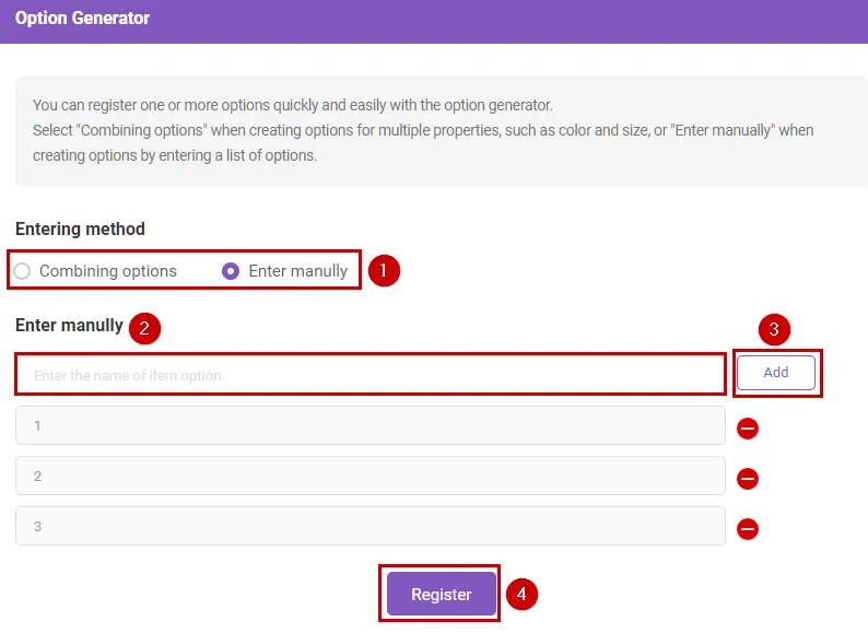 Enter option name (Enter manully) : In “Enter manully” mode, you can enter the name of each option directly. In the case of “Combining options”, you can register the properties to be combined.