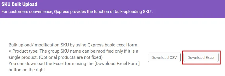The template for entering product information can be downloaded from the upper right corner of the upload pop-up window. There is a [CVS format download] button and a [XLSX format download] button. Normally we use XLSX files.