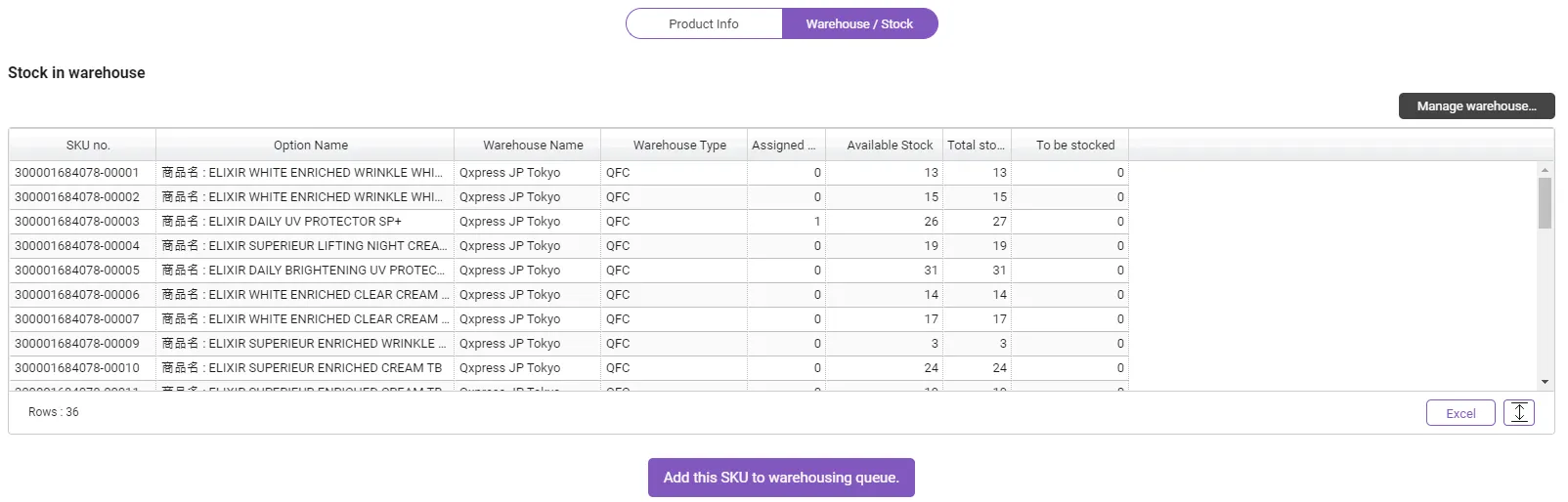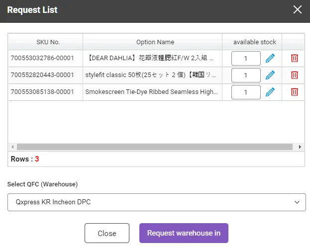 Convenient stock management: By selecting multiple SKUs, you can quickly check availability of only the selected SKUs, and easily add the selected SKUs to the warehousing list.